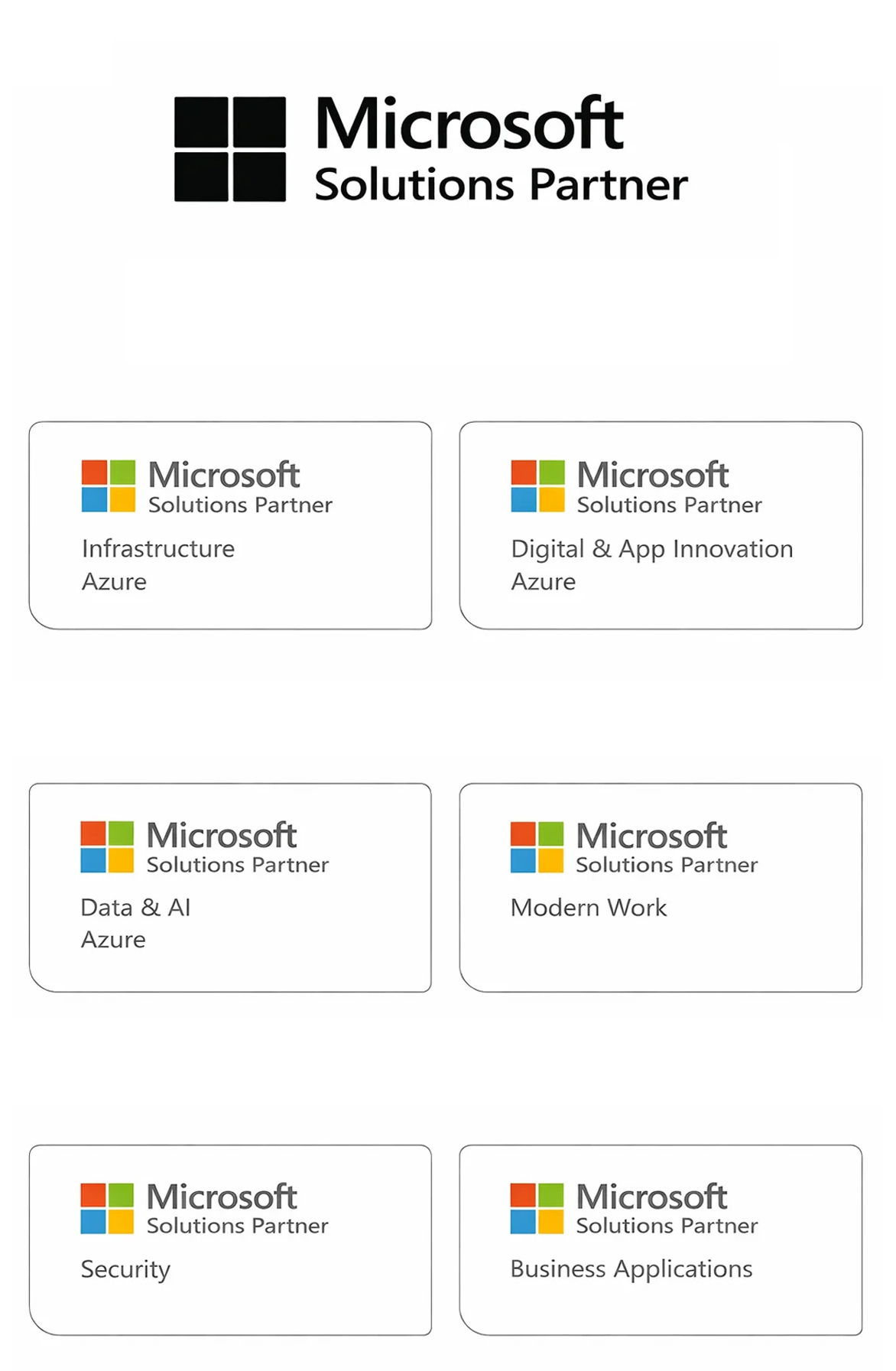 Certificación que garantiza ejecución Somos Microsoft Solution Partner Infrastructure Azure, Security, Data & AI, Modern Work, Digital & App Innovation y Business Applications. No es un sello comercial: es una validación técnica que Microsoft audita y renueva para garantizar capacidad de ejecución real.